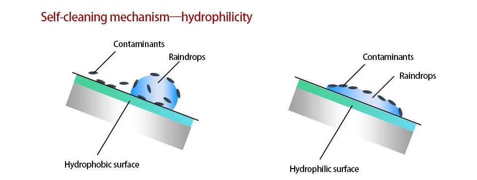 The photocatalytic effect causes water to spread onto the sheet surface into a thin film. When rainwater flows over, it easily carries away the decomposed pollutants, achieving a “rainwater-cleaning” effect.